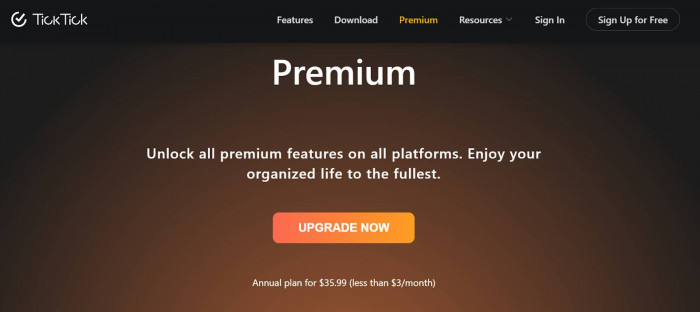 TickTick pricing is typically simpler: Free versus Premium. The official upgrade page highlights an annual Premium plan at $35.99. If you prefer monthly billing, many software directories list Premium at $2.99 per month, though exact pricing can vary by store or region.
