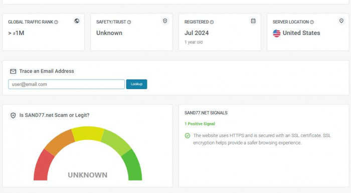 ● sand77.online is flagged as “likely unsafe” by ScamAdviser and shows WHOIS identity hidden plus “very young” domain commentary and low-rank signals.
