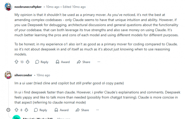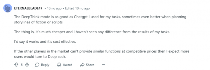 - On Reddit, some say DeepSeek makes roleplaying games and creative writing more flexible and contextual better than rivals for keeping character or story context.