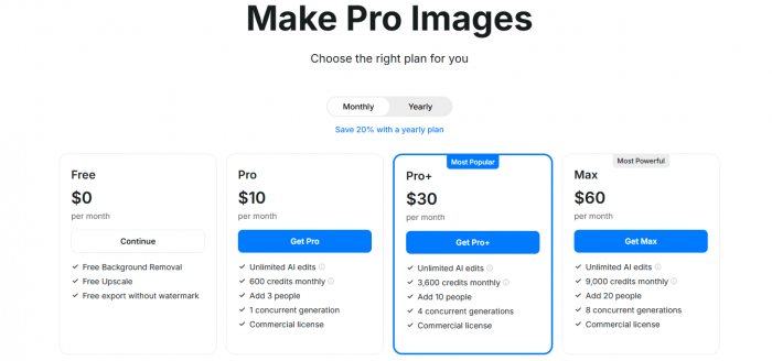 - Free plan (basic removal, upscaling, watermark-free exports)