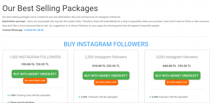 Offers multiple Instagram growth packages with “before” and “after” discount pricing in Turkish Lira, covering followers, likes, and related services. The site claims these come from real daily active users, warns that drops will happen because real users may unfollow, and suggests using the service on attractive, high-quality pages to keep more followers. Several packages show a clear markdown from a higher crossed-out price to a lower sale price, and the page also lists a WhatsApp number for direct support or custom deals.