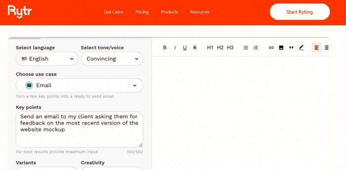 Rytr combines AI content generation with rewriting features, allowing users to generate and rephrase text within the same workflow. Pricing starts at $9/month, with a limited free plan.