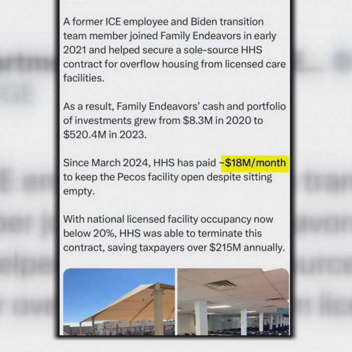 According to published reports, since early 2024, HHS was paying roughly $18 million per month to Family Endeavors to run the Pecos facility even while the center reportedly had minimal or no occupancy. DOGE officials claimed that this spending continued despite licensed shelter occupancy being below 20% nationwide, leading to the decision to terminate the contract as an effort to save taxpayer money.