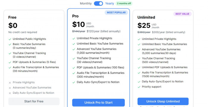 3. Unlimited plan: about $25 per month with higher limits and priority features (Glasp)