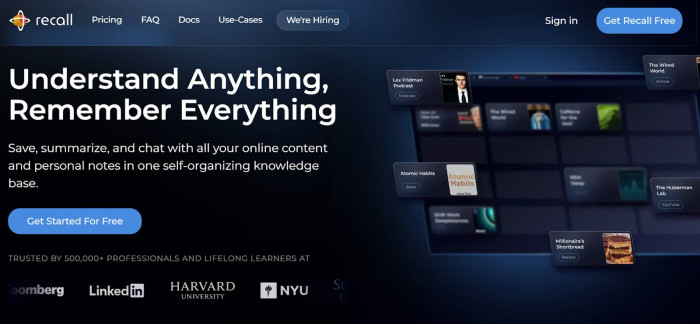 Recall AI, also known as GetRecall, takes a different approach compared with many summarization tools. Instead of generating summaries that disappear after use, it builds a structured knowledge base from the content you consume.
