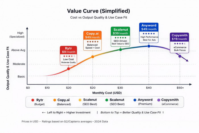 Copy.ai sits in the middle where pricing is higher than Rytr but justified by speed and scalability. Scalenut offers strong value for SEO-focused users because it reduces the need for separate keyword tools.