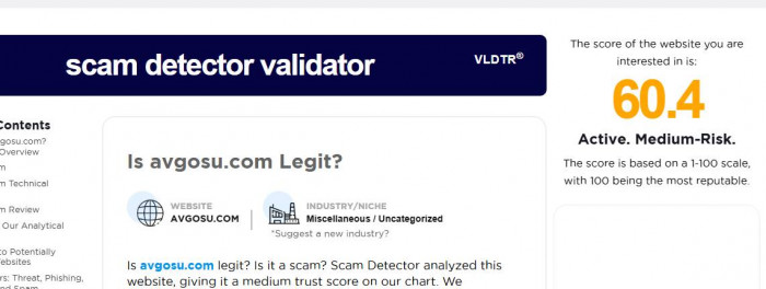 In contrast, another review tool gives avgosu.com a more moderate trust score of 60.4 out of 100, suggesting the site falls into a “medium‑risk” category. This assessment acknowledges some unknowns, like potential proximity to suspicious internet destinations and internal threat indicators related to phishing or spam, but does not outright label the site a dangerous scam. (Scam Detector)