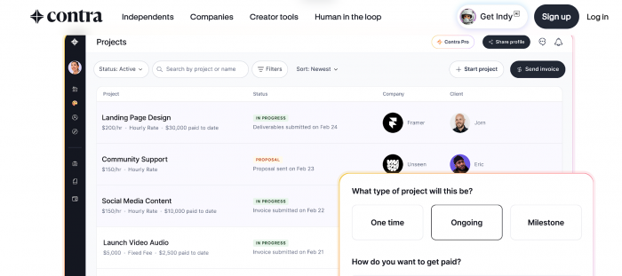 Contra has risen quickly as a favorite for writers seeking a professional, commission-free platform. With 0% fees and a minimum project rate of around $25 per hour, it caters to content marketers, copywriters, and technical writers targeting premium clients. The best part your portfolio itself becomes your calling card here.