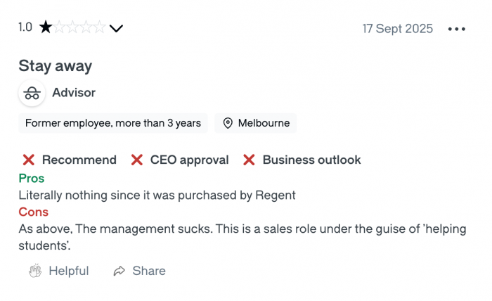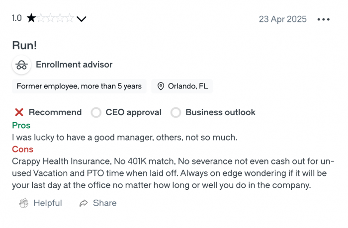 Glassdoor reviews paint a bleak picture. Across 79 reviews, the company averages 2.8 stars, well below the education industry’s 3.7-star average. A recurring theme emerges: