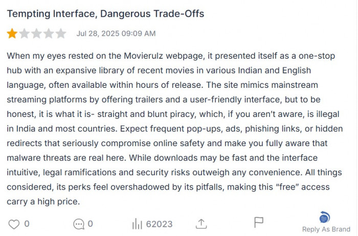 Some users are thrilled by the sheer range of languages, with rare indie films or regional blockbusters appearing within hours of release. For rural or budget audiences who can't easily afford multiplex tickets or OTT subscriptions, Movierulz is seen as a lifesaver. Fans also love the convenience, no complicated setup, easy search, massive library.