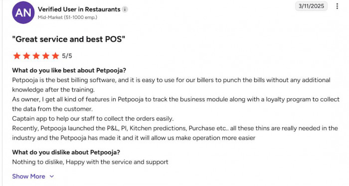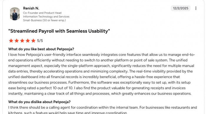 4. The same G2 review notes Petpooja was very easy to set up and is useful for instantly generating invoices and keeping clear transaction records.