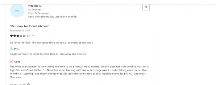 5. Some users on Capterra mention that while the dashboard and reporting are strong, menu updates can be time‑consuming and cloud‑kitchen live order tracking is limited.