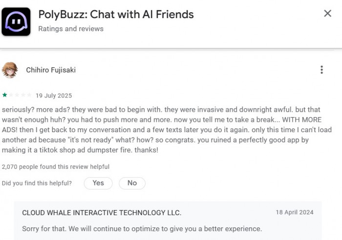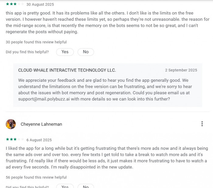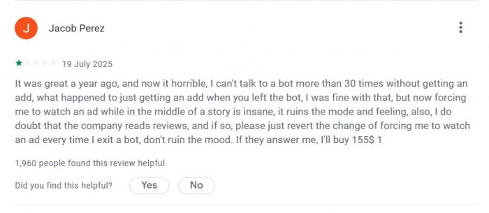- On Monetization: Some report ad or coin interruptions as intrusive, especially after the most recent updates. Others note that the free plan is still usable for casual chats and stories, with friction mainly for power users.
